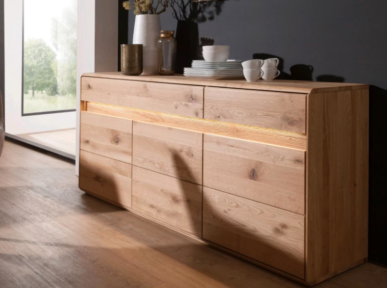 Sideboard I , Eiche massiv Sandgestrahlt ,B 183,5 cm Höhe 86 cm Tiefe 43,5 cm Inkl. Beleuchtung